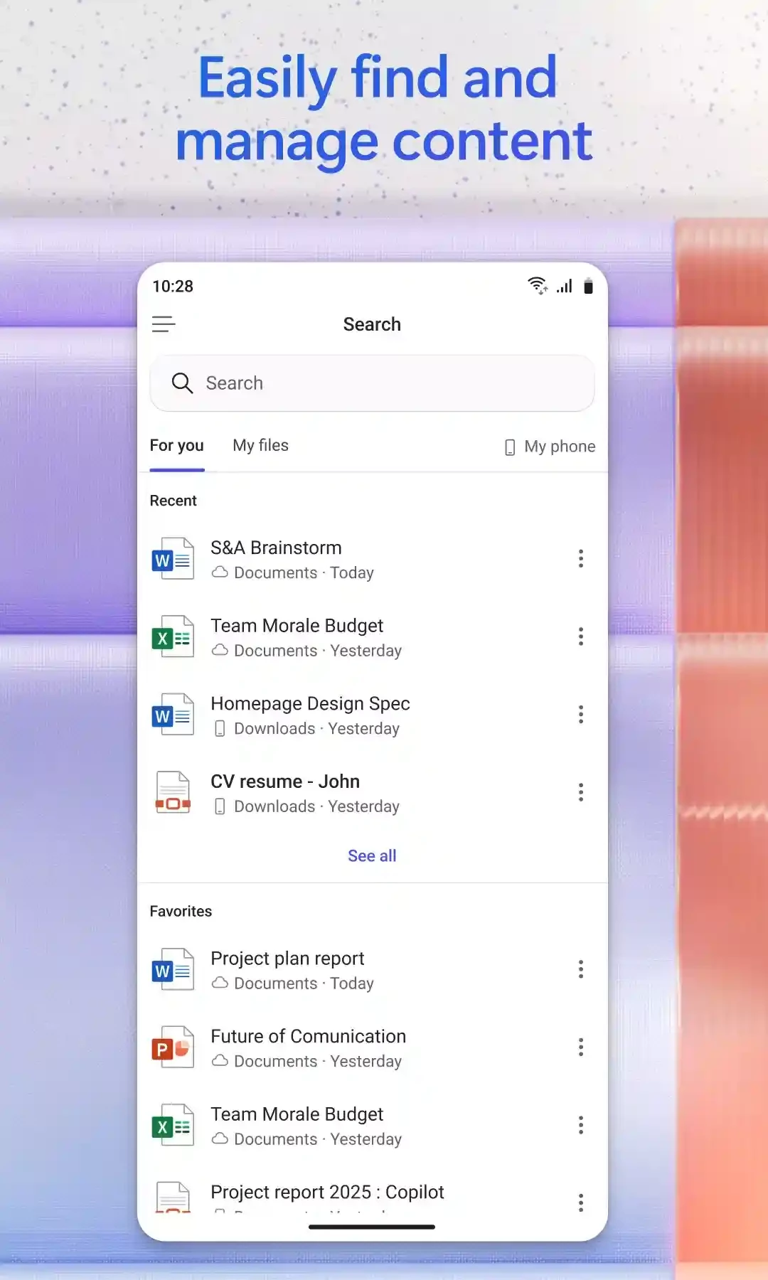 Mobilna wersja pakietu Microsoft Office 365 obsługuje wiele formatów plików, takich jak DOCX, XLSX, PPTX, PDF itd. Umożliwia ona również przeglądanie starszych formatów pakietu Office, takich jak .DOC, .XLS, PPT itd., a także zapewnia zgodność ze starszymi formatami pakietu Office oraz umożliwia konwersję lub eksportowanie plików do innych formatów.